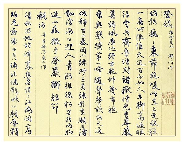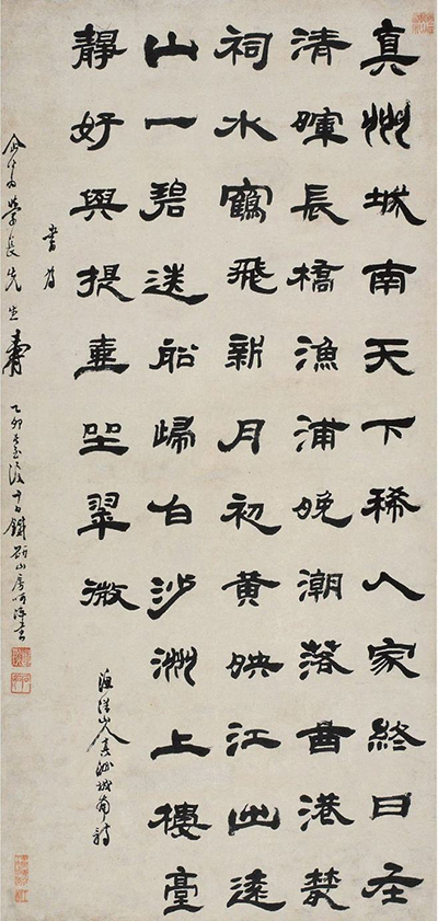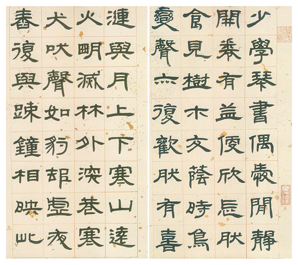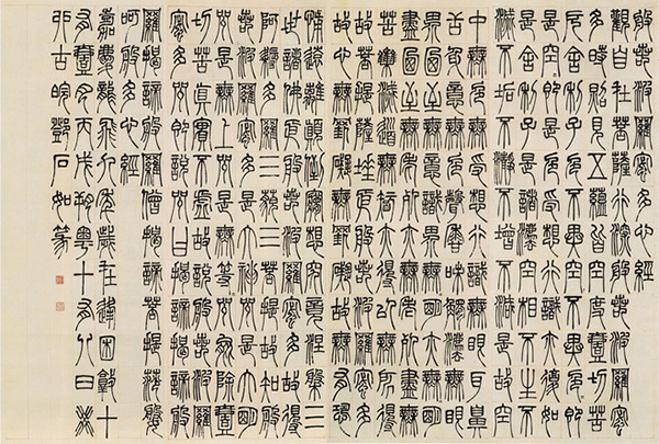 梅氏是江左望族,收藏秦漢以來金石拓本甚富,鄧石如在梅家得以飽覽古代石刻拓本,各大家碑帖每種臨摹百本。又因篆體不備,遂發奮旁搜三代鐘鼎,秦、漢瓦當、碑額。砥礪苦學五年,乃學篆書成,手寫《說文解字》二十本,半年完成。后學漢分,大饗諸碑,各五十本,三年,分書始成。 在這番系統臨習后,鄧石如的書法步入正軌。后人思之書藝造詣,與其長期刻苦磨練是密不可分的。沙孟先生說:“清代書人,公推為卓然大家的,不是東閣學士劉墉,也不是內閣學士翁方綱,偏是那位藤杖芒鞋的鄧石如。”湖光總督畢沅對鄧石如也十分欽佩,他曾說:“山人,吾幕府一服清涼散也!”一位布衣書家,受到如此贊譽,并被后人公認為中國書法史上開宗立派的大家,可見其對書法篆刻藝術的貢獻,甚至可以與王羲之、顏真卿等比肩,值得我們不斷地深入學習。