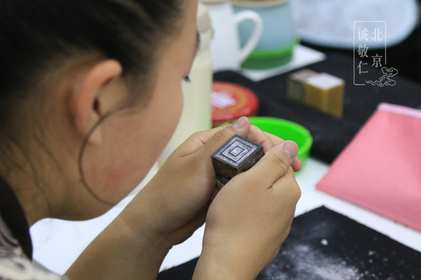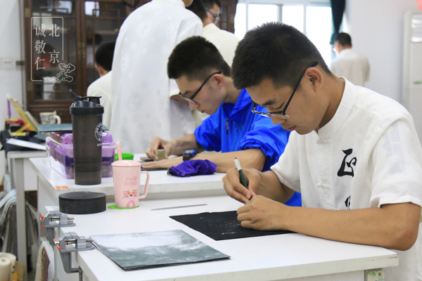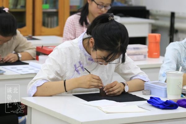現(xiàn)場(chǎng)采用實(shí)物投影技術(shù),一邊示范一邊詳細(xì)講解,方便同學(xué)們直觀(guān)了解要領(lǐng),有疑問(wèn)時(shí)可隨時(shí)抬頭觀(guān)看回放。 磨平印面:去除浮躁,磨平心性 學(xué)習(xí)步驟先從磨平印面開(kāi)始,對(duì)于初學(xué)者來(lái)說(shuō),一方石頭六面都磨平也不是一件簡(jiǎn)單的事情,在老師耐心指導(dǎo)與嚴(yán)格要求下,同學(xué)們耐住性子,在磨石中慢慢磨平了心性,對(duì)力道的掌控也有了精準(zhǔn)敏感度,在反復(fù)觀(guān)察印面是否方正的過(guò)程中也不斷提升著精準(zhǔn)的眼力。