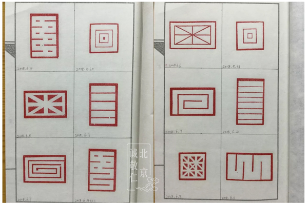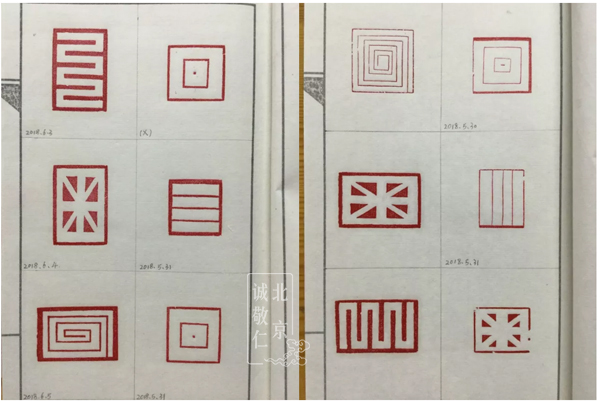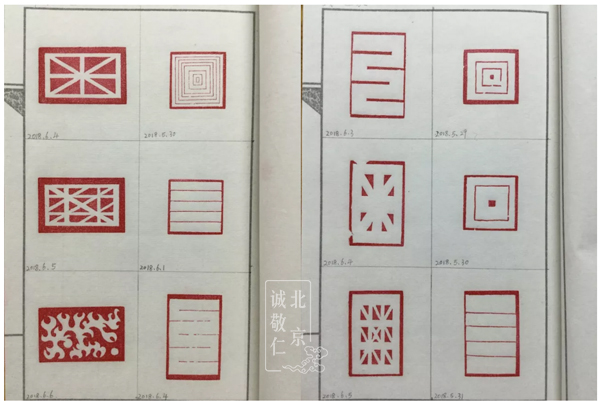 作業(yè)印譜本上滿(mǎn)滿(mǎn)的印章,記錄著大家認(rèn)真的付出。 嚴(yán)格要求初學(xué)者至少完成六方形狀各異的直線(xiàn)圖案,經(jīng)老師檢查過(guò)關(guān)后方可進(jìn)入下一關(guān)。