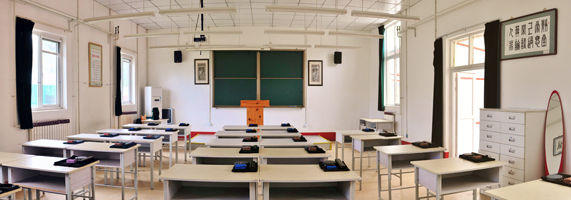 教學區的書法教室里,窗明幾凈,室內為大家配備了空調暖氣設備,以便學員在不同季節都能舒適地學習。同時教室裝有先進的多媒體教學設備,為大家提供豐富多元的書法教學。懸掛于講臺兩側的孔老夫子像,給教室帶來濃厚而莊嚴的敬學氣氛。墻壁兩側,楊淑芬老師親筆書寫的墨寶「感恩與祈盼」以及「八榮八恥」,如同老師的諄諄誨勉,鼓勵著學子們德藝雙修。在干凈整潔的課桌上,整齊地擺放著大家學習用的文房四寶,墨香縈繞。