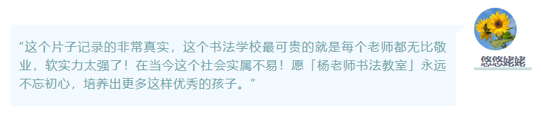 2020年11月19日,「楊老師書法教室」發布的一則視頻《推薦!好的學習氛圍 對孩子學前影響有多大》在家長群里引起了熱議,大家紛紛留言表達對「楊老師書法教室」教學的感受。其中有一則留言格外引人注目: