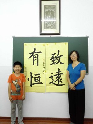 2. 一轉眼,東東已經在「楊老師書法教室」學習書法十個月了,不光寫字有進步,性格也比以前安靜,謙虛,有耐心,待人也比以前友善了。德行的進步也是在楊老師書法教室學書法的收獲之一。今年暑假,楊老師書法教室在彰化路建立分部,剛好離我們家更近,上課也更便捷了。暑假鄭老師讓東東寫了兩幅作品「至善」和「有恒」,我想這也是老師對孩子的期望,希望東東能在書法道路上做好這兩點——精益求精,持之以恒。