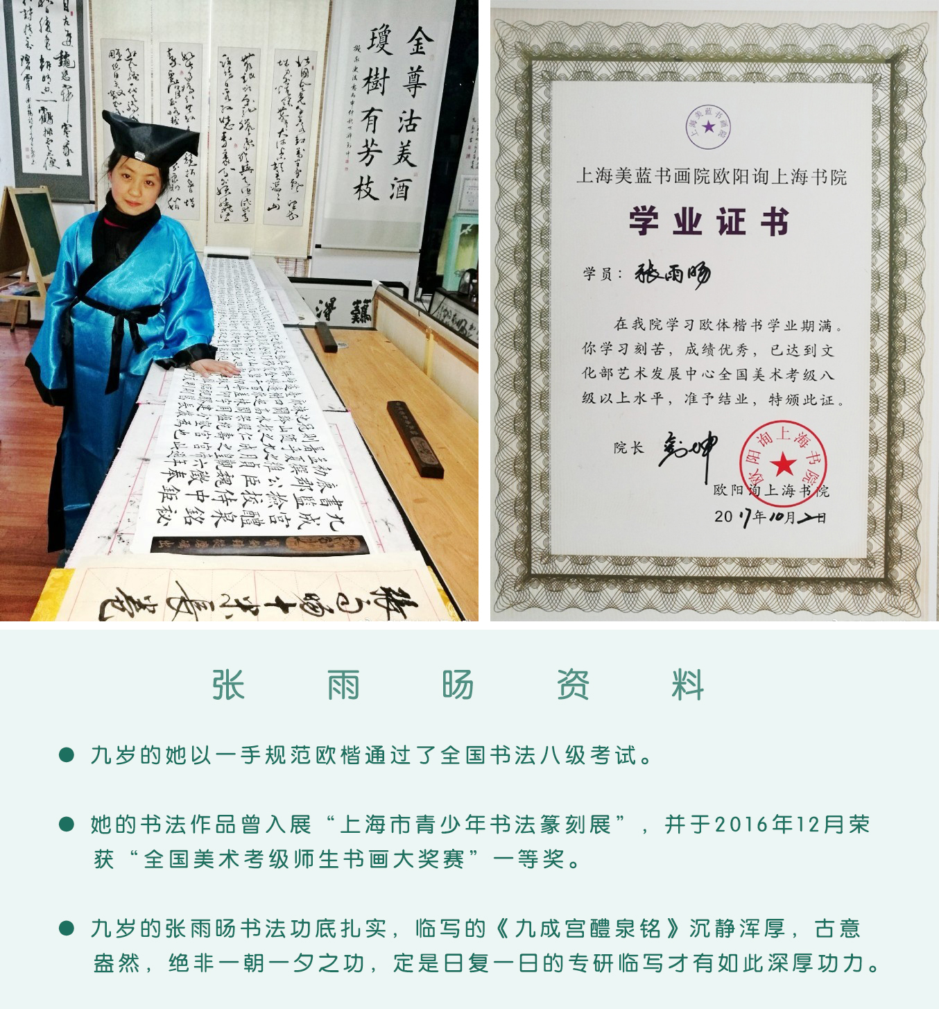 近日,在中國上海有位名叫張雨旸的小女孩兒,以其一手規(guī)范嚴(yán)謹(jǐn)?shù)臍W楷《九成宮醴泉銘》引起了網(wǎng)絡(luò)褒貶不一的熱議。
