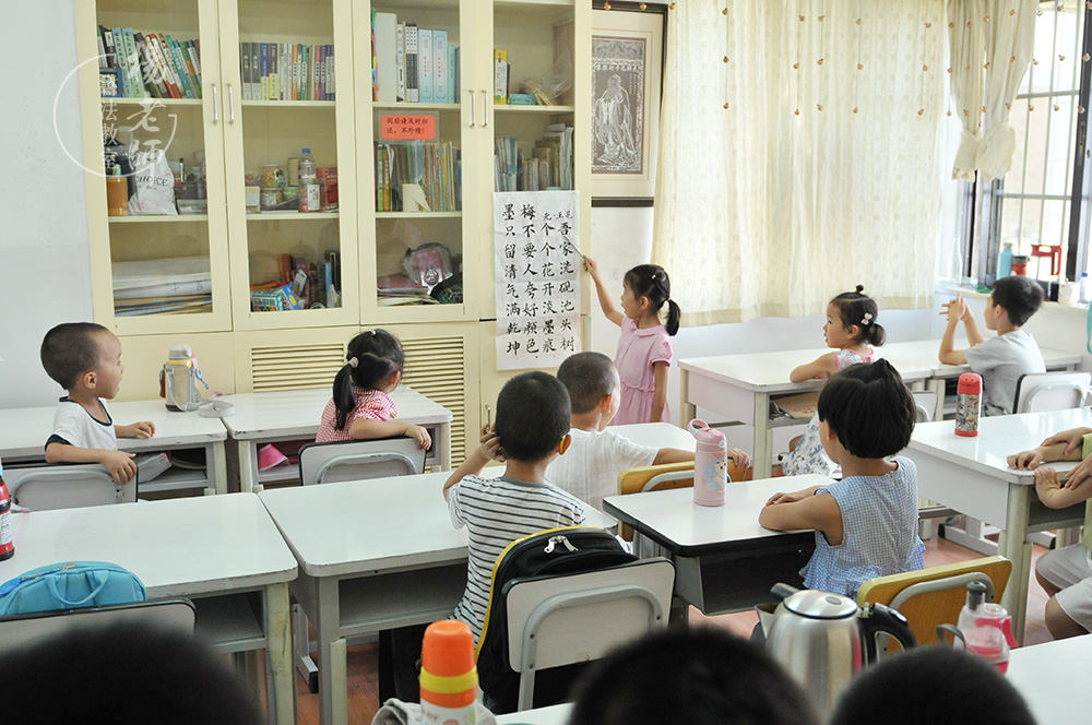 丫丫性格靦腆、內向,和幼兒園老師、小朋友的交流都很少。導致她不愛上幼兒園,每天早上都不太高興,到了大班還時常掉眼淚。而到書法教室后,這里的老師們耐心引導她,鍛煉她當司儀、大聲讀經、整隊等。還建議我們多放手,不要事事照顧得太周到,孩子自己會的事情多了,信心增長,就會變得活潑勇敢。