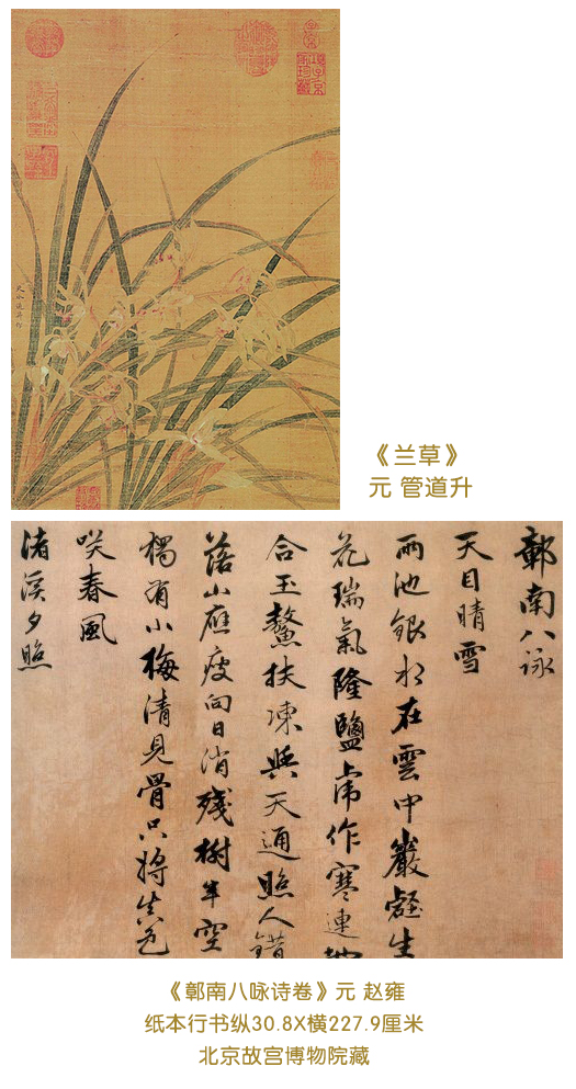 趙孟頫的二子趙雍、趙奕并以書畫知名,而其夫人管道升聰敏過人,能書善詞,繪畫精于墨竹、梅、蘭,筆意精絕。元仁宗曾取管道升的書法,與趙孟頫及其次子趙雍的書法用玉軸精裝,鈐上御印藏于秘書監,說:“讓后世知道我朝有一家的夫婦父子都善書,這也是奇事啊!”
