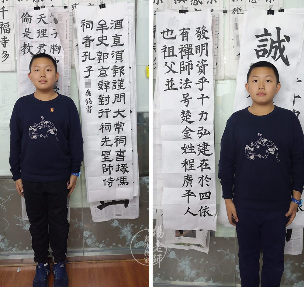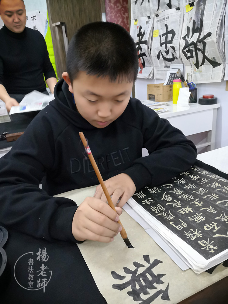 禹銘是在即將上小學三年級之前的暑期開始學習書法。那時,「楊老師書法教室」海淀分校區(qū)剛開張,禹銘是第一個進教室學習的學生。他給人的印象是比較實干、努力。每節(jié)課他都很珍惜,非常注意保持正確的站姿和書寫姿勢,因為認真全神貫注投入,經(jīng)常會寫到滿頭大汗。