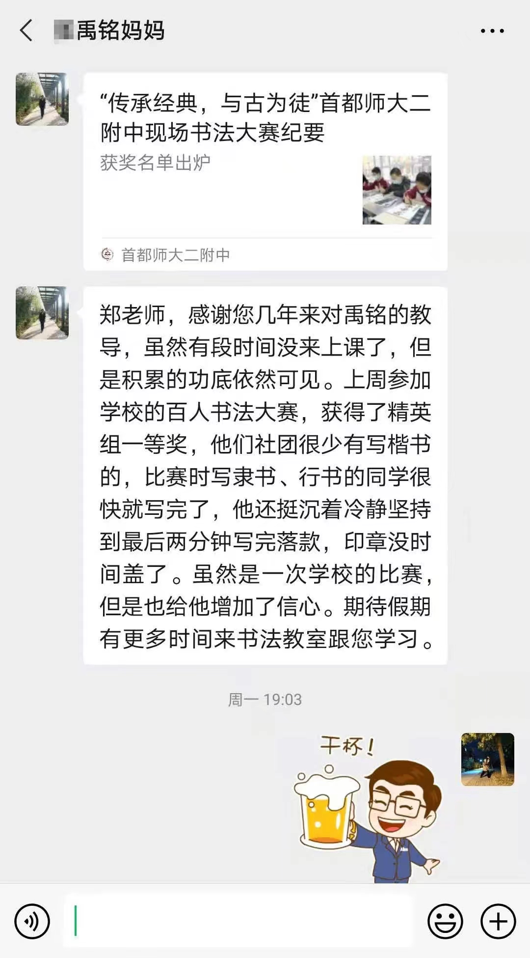 “鄭老師,感謝您幾年來對禹銘的教導,雖然有段時間沒來上課了,但是積累的功底依然可見。上周參加學校的百人書法大賽,獲得了精英組一等獎,他們社團很少有寫楷書的,比賽時寫隸書、行書的同學很快就寫完了,他還挺沉著冷靜堅持到最后兩分鐘寫完落款,印章沒時間蓋了。雖然是一次學校的比賽,但是也給他增加了信心。期待假期有更多時間來書法教室跟您學習。”