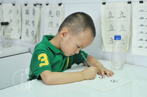 小星星剛開始是描筆畫,現在慢慢進階到描字,并且他也特別喜歡描字。可是第一本基本筆畫還沒描完,媽媽有時不同意他描字。小家伙想想說:「我想了個辦法,那我就先描兩張筆畫,然后您就獎勵我描一張字吧!」看著孩子那么純真、熱切,愛妥協的媽媽又同意了。開始描字的小星星很興奮,勾好一個字的邊框后,把描紅紙拿到媽媽面前:「媽媽,您幫我寫1、2、3。」「什么?寫什么1、2、3?」「就是,就是,第1描哪個,第2描哪個。」媽媽這才明白,原來是筆畫順序呀,一定是書法教室老師教給他的。媽媽這么粗心,原來小朋友學寫字,就是從第一筆寫什么、第二筆寫什么學起的呀。在這兒,特別感恩楊老師書法教室的老師們,教給孩子們讀書、認字、寫字,給一顆顆小小的心田里播下了愛中國字、愛傳統文化的種子。