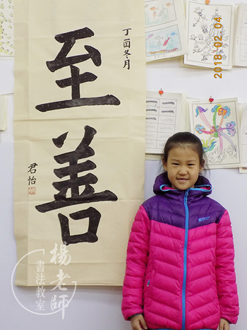 曦文,就像她的名字一樣充滿著晨曦的喜悅,當小姨提前接她下課時,曦文默默地收筆,準備洗筆,老師看到曦文筆法還有需要突破的地方就叫住曦文,讓她再寫一張,曦文開心地轉身,興奮地高呼:“耶——!”把在場的長輩都逗笑了,可見她多么熱愛書法啊!