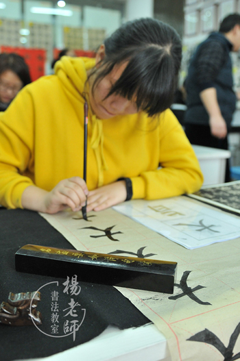 母親表示:學習書法,心態日趨平和,靜心修身養性,工作和生活更和諧了。女兒楊同學正為西城區藝術節準備作品。