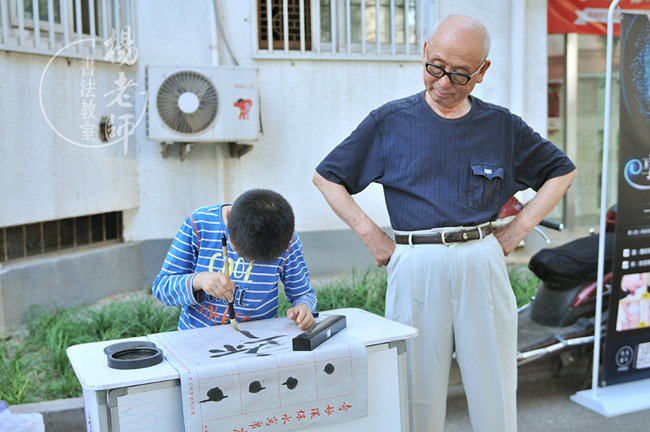 小區(qū)的老爺爺略有心得地品賞著永字八法的勁道運(yùn)筆。