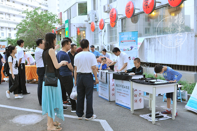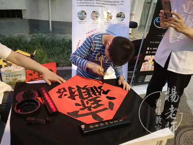 2018年6月14日星期四,下午六時(shí)許,「楊老師書法教室」師生一行如約來(lái)到小區(qū)活動(dòng)中心,準(zhǔn)備將創(chuàng)新多元的快樂(lè)藝術(shù)學(xué)習(xí)法分享給小區(qū)的居民。剛準(zhǔn)備好學(xué)習(xí)用品,一位母親帶著孩子走過(guò),馬上被這多姿多彩的藝術(shù)學(xué)習(xí)吸引了,他們駐足停留。孩子在老師和同學(xué)的熱心幫助下體驗(yàn)著新穎的學(xué)習(xí)。
