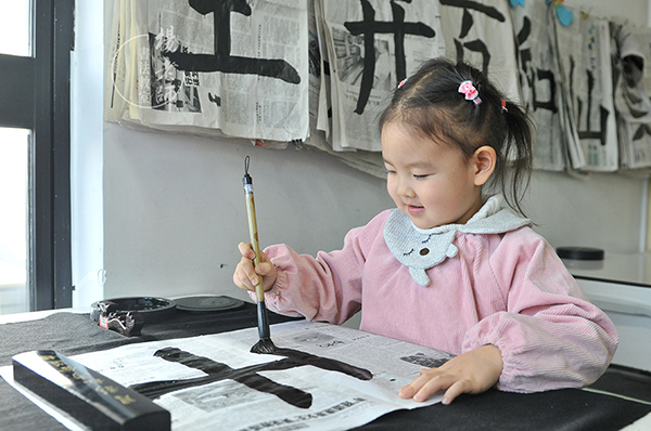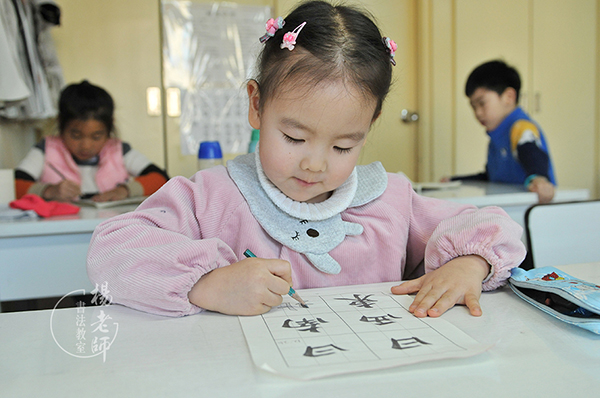 2017年11月1日,慧慧來到「楊老師書法教室」學(xué)習(xí),由于從未上過幼兒園,所以她極力拒絕和抵抗書法教室的學(xué)習(xí)生活。從每天早上“下暴雨”進(jìn)教室,到學(xué)習(xí)時(shí)間不停地找媽媽,晚上做夢(mèng)都在講明天不去上學(xué),我看了很是心疼。從前在家倒也聽話乖巧的女兒,怎么帶她走過這段過渡期呢?在周老師明智的指導(dǎo)下,我報(bào)名學(xué)習(xí)了書法,每周兩次課程,其余時(shí)間自己在家練習(xí)。選擇將書法教室的學(xué)習(xí)生活延伸到家中的做法,對(duì)女兒的帶動(dòng)性很大。她不但不抵觸寫大字,還特別熱衷于當(dāng)我的小老師,當(dāng)看到我怎么也寫不好右側(cè)點(diǎn)時(shí),她有模有樣地教我,“小點(diǎn)下筆,坐下來,左轉(zhuǎn)彎,頓三下?!笨此J(rèn)真的表情,可愛又好笑。