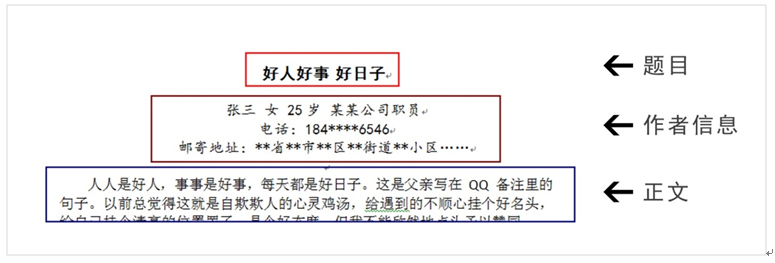 題目下方用楷體四號標注:作者姓名、性別、年齡、工作單位或學校年級、聯系電話和通信地址(有關獎品寄送)